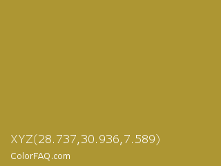 XYZ 28.737,30.936,7.589 Color is a normal yellow color and the nearest color is Alpine #af8f2c. Hex code #ad9633 and RGB value is rgb(173,150,51). In RGB color space, this color is composed of 68% red, 59% green, 20% blue, In CMYK color space, this color is composed of 0% cyan, 13% magenta, 71% yellow , 32% black , In HSL color space, this color has a hue angle of 49° , 54% saturation and 44% lightness.
