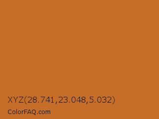 XYZ 28.741,23.048,5.032 Color is a normal orange color and the nearest color is Liver Dogs #b86d29. Hex code #c46e29 and RGB value is rgb(196,110,41). In RGB color space, this color is composed of 77% red, 43% green, 16% blue, In CMYK color space, this color is composed of 0% cyan, 44% magenta, 79% yellow , 23% black , In HSL color space, this color has a hue angle of 27° , 65% saturation and 46% lightness.