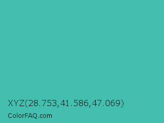 XYZ 28.753,41.586,47.069 Color is a normal cyan color and the nearest color is Puerto Rico #3fc1aa. Hex code #44bfaf and RGB value is rgb(68,191,175). In RGB color space, this color is composed of 27% red, 75% green, 69% blue, In CMYK color space, this color is composed of 64% cyan, 0% magenta, 8% yellow , 25% black , In HSL color space, this color has a hue angle of 172° , 49% saturation and 51% lightness.