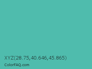 XYZ 28.75,40.646,45.865 Color is a normal cyan color and the nearest color is Verdigris #43b3ae. Hex code #4fbcad and RGB value is rgb(79,188,173). In RGB color space, this color is composed of 31% red, 74% green, 68% blue, In CMYK color space, this color is composed of 58% cyan, 0% magenta, 8% yellow , 26% black , In HSL color space, this color has a hue angle of 172° , 45% saturation and 52% lightness.