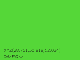 XYZ 28.761,50.818,12.034 Color is a normal green color and the nearest color is Lime Green #32cd32. Hex code #55d738 and RGB value is rgb(85,215,56). In RGB color space, this color is composed of 33% red, 84% green, 22% blue, In CMYK color space, this color is composed of 60% cyan, 0% magenta, 74% yellow , 16% black , In HSL color space, this color has a hue angle of 109° , 67% saturation and 53% lightness.