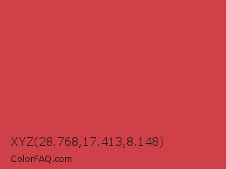 XYZ 28.768,17.413,8.148 Color is a normal red color and the nearest color is English Vermillion #cc474b. Hex code #cf4049 and RGB value is rgb(207,64,73). In RGB color space, this color is composed of 81% red, 25% green, 29% blue, In CMYK color space, this color is composed of 0% cyan, 69% magenta, 65% yellow , 19% black , In HSL color space, this color has a hue angle of 356° , 60% saturation and 53% lightness.