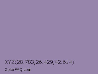 XYZ 28.783,26.429,42.614 Color is a normal violet color and the nearest color is Lavender Purple #967bb6. Hex code #9885ac and RGB value is rgb(152,133,172). In RGB color space, this color is composed of 60% red, 52% green, 67% blue, In CMYK color space, this color is composed of 12% cyan, 23% magenta, 0% yellow , 33% black , In HSL color space, this color has a hue angle of 269° , 19% saturation and 60% lightness.