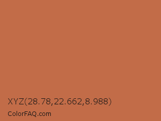 XYZ 28.78,22.662,8.988 Color is a normal orange color and the nearest color is Copper Red #cb6d51. Hex code #c26c48 and RGB value is rgb(194,108,72). In RGB color space, this color is composed of 76% red, 42% green, 28% blue, In CMYK color space, this color is composed of 0% cyan, 44% magenta, 63% yellow , 24% black , In HSL color space, this color has a hue angle of 18° , 50% saturation and 52% lightness.