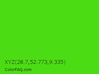 XYZ 28.7,52.773,9.335 Color is a normal green color and the nearest color is Harlequin Green #46cb18. Hex code #4cdc14 and RGB value is rgb(76,220,20). In RGB color space, this color is composed of 30% red, 86% green, 8% blue, In CMYK color space, this color is composed of 65% cyan, 0% magenta, 91% yellow , 14% black , In HSL color space, this color has a hue angle of 103° , 83% saturation and 47% lightness.