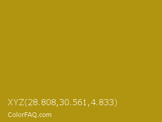 XYZ 28.808,30.561,4.833 Color is a normal yellow color and the nearest color is Sahara #b7a214. Hex code #b1940f and RGB value is rgb(177,148,15). In RGB color space, this color is composed of 69% red, 58% green, 6% blue, In CMYK color space, this color is composed of 0% cyan, 16% magenta, 92% yellow , 31% black , In HSL color space, this color has a hue angle of 49° , 84% saturation and 38% lightness.