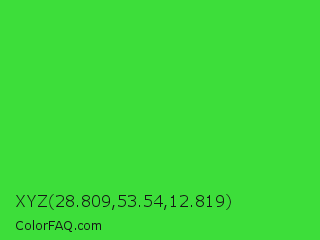 XYZ 28.809,53.54,12.819 Color is a normal green color and the nearest color is Lime Green #32cd32. Hex code #3dde3a and RGB value is rgb(61,222,58). In RGB color space, this color is composed of 24% red, 87% green, 23% blue, In CMYK color space, this color is composed of 73% cyan, 0% magenta, 74% yellow , 13% black , In HSL color space, this color has a hue angle of 119° , 71% saturation and 55% lightness.