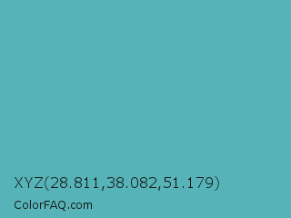 XYZ 28.811,38.082,51.179 Color is a normal cyan color and the nearest color is Fountain Blue #56b4be. Hex code #56b4b8 and RGB value is rgb(86,180,184). In RGB color space, this color is composed of 34% red, 71% green, 72% blue, In CMYK color space, this color is composed of 53% cyan, 2% magenta, 0% yellow , 28% black , In HSL color space, this color has a hue angle of 182° , 41% saturation and 53% lightness.