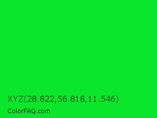 XYZ 28.822,56.818,11.546 Color is a normal green color and the nearest color is Vivid Malachite #00cc33. Hex code #0ae629 and RGB value is rgb(10,230,41). In RGB color space, this color is composed of 4% red, 90% green, 16% blue, In CMYK color space, this color is composed of 96% cyan, 0% magenta, 82% yellow , 10% black , In HSL color space, this color has a hue angle of 128° , 92% saturation and 47% lightness.