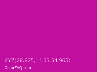 XYZ 28.825,14.33,34.965 Color is a normal magenta color and the nearest color is Red Violet #c71585. Hex code #c20da1 and RGB value is rgb(194,13,161). In RGB color space, this color is composed of 76% red, 5% green, 63% blue, In CMYK color space, this color is composed of 0% cyan, 93% magenta, 17% yellow , 24% black , In HSL color space, this color has a hue angle of 311° , 87% saturation and 41% lightness.