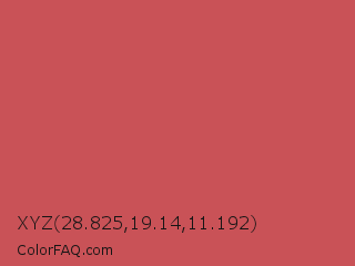 XYZ 28.825,19.14,11.192 Color is a normal red color and the nearest color is Fuzzy Wuzzy Brown #c45655. Hex code #c95257 and RGB value is rgb(201,82,87). In RGB color space, this color is composed of 79% red, 32% green, 34% blue, In CMYK color space, this color is composed of 0% cyan, 59% magenta, 57% yellow , 21% black , In HSL color space, this color has a hue angle of 357° , 52% saturation and 55% lightness.