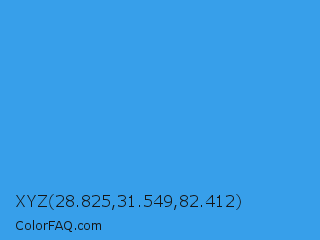 XYZ 28.825,31.549,82.412 Color is a normal blue color and the nearest color is Button Blue #24a0ed. Hex code #379fea and RGB value is rgb(55,159,234). In RGB color space, this color is composed of 22% red, 62% green, 92% blue, In CMYK color space, this color is composed of 76% cyan, 32% magenta, 0% yellow , 8% black , In HSL color space, this color has a hue angle of 205° , 81% saturation and 57% lightness.