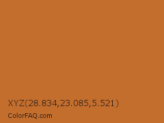 XYZ 28.834,23.085,5.521 Color is a normal orange color and the nearest color is Liver Dogs #b86d29. Hex code #c46e2e and RGB value is rgb(196,110,46). In RGB color space, this color is composed of 77% red, 43% green, 18% blue, In CMYK color space, this color is composed of 0% cyan, 44% magenta, 77% yellow , 23% black , In HSL color space, this color has a hue angle of 26° , 62% saturation and 47% lightness.