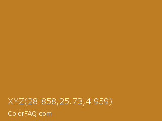 XYZ 28.858,25.73,4.959 Color is a normal orange color and the nearest color is University Of California Gold #b78727. Hex code #be7d22 and RGB value is rgb(190,125,34). In RGB color space, this color is composed of 75% red, 49% green, 13% blue, In CMYK color space, this color is composed of 0% cyan, 34% magenta, 82% yellow , 25% black , In HSL color space, this color has a hue angle of 35° , 70% saturation and 44% lightness.