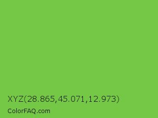 XYZ 28.865,45.071,12.973 Color is a normal green color and the nearest color is Mantis #74c365. Hex code #75c746 and RGB value is rgb(117,199,70). In RGB color space, this color is composed of 46% red, 78% green, 27% blue, In CMYK color space, this color is composed of 41% cyan, 0% magenta, 65% yellow , 22% black , In HSL color space, this color has a hue angle of 98° , 54% saturation and 53% lightness.