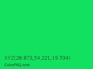 XYZ 28.873,54.221,19.534 Color is a normal green color and the nearest color is Malachite #0bda51. Hex code #0fe05e and RGB value is rgb(15,224,94). In RGB color space, this color is composed of 6% red, 88% green, 37% blue, In CMYK color space, this color is composed of 93% cyan, 0% magenta, 58% yellow , 12% black , In HSL color space, this color has a hue angle of 143° , 87% saturation and 47% lightness.