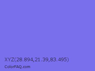 XYZ 28.894,21.39,83.495 Color is a light indigo color and the nearest color is Medium Slate Blue #7b68ee. Hex code #796eee and RGB value is rgb(121,110,238). In RGB color space, this color is composed of 47% red, 43% green, 93% blue, In CMYK color space, this color is composed of 49% cyan, 54% magenta, 0% yellow , 7% black , In HSL color space, this color has a hue angle of 245° , 79% saturation and 68% lightness.