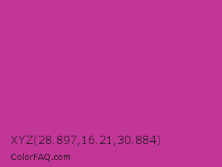XYZ 28.897,16.21,30.884 Color is a normal magenta color and the nearest color is Byzantine #bd33a4. Hex code #c13697 and RGB value is rgb(193,54,151). In RGB color space, this color is composed of 76% red, 21% green, 59% blue, In CMYK color space, this color is composed of 0% cyan, 72% magenta, 22% yellow , 24% black , In HSL color space, this color has a hue angle of 318° , 56% saturation and 48% lightness.