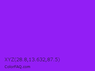 XYZ 28.8,13.632,87.5 Color is a normal purple color and the nearest color is Veronica #a020f0. Hex code #921ef5 and RGB value is rgb(146,30,245). In RGB color space, this color is composed of 57% red, 12% green, 96% blue, In CMYK color space, this color is composed of 40% cyan, 88% magenta, 0% yellow , 4% black , In HSL color space, this color has a hue angle of 272° , 91% saturation and 54% lightness.