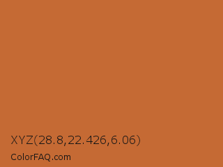 XYZ 28.8,22.426,6.06 Color is a normal orange color and the nearest color is Tuscany #bd5e2e. Hex code #c56a34 and RGB value is rgb(197,106,52). In RGB color space, this color is composed of 77% red, 42% green, 20% blue, In CMYK color space, this color is composed of 0% cyan, 46% magenta, 74% yellow , 23% black , In HSL color space, this color has a hue angle of 22° , 58% saturation and 49% lightness.