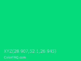 XYZ 28.907,52.1,26.945 Color is a normal green color and the nearest color is Caribbean Green #00cc99. Hex code #05db7a and RGB value is rgb(5,219,122). In RGB color space, this color is composed of 2% red, 86% green, 48% blue, In CMYK color space, this color is composed of 98% cyan, 0% magenta, 44% yellow , 14% black , In HSL color space, this color has a hue angle of 153° , 96% saturation and 44% lightness.
