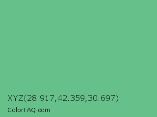 XYZ 28.917,42.359,30.697 Color is a normal green color and the nearest color is Silver Tree #66b58f. Hex code #66c08a and RGB value is rgb(102,192,138). In RGB color space, this color is composed of 40% red, 75% green, 54% blue, In CMYK color space, this color is composed of 47% cyan, 0% magenta, 28% yellow , 25% black , In HSL color space, this color has a hue angle of 144° , 42% saturation and 58% lightness.