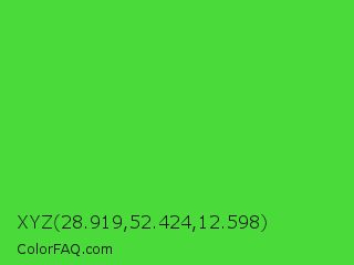 XYZ 28.919,52.424,12.598 Color is a normal green color and the nearest color is Lime Green #32cd32. Hex code #4adb3a and RGB value is rgb(74,219,58). In RGB color space, this color is composed of 29% red, 86% green, 23% blue, In CMYK color space, this color is composed of 66% cyan, 0% magenta, 74% yellow , 14% black , In HSL color space, this color has a hue angle of 114° , 69% saturation and 54% lightness.