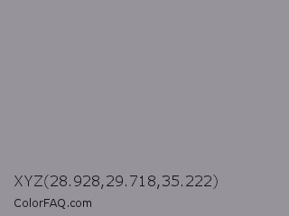 XYZ 28.928,29.718,35.222 Color is a normal violet color and the nearest color is Mountain Mist #959396. Hex code #96939b and RGB value is rgb(150,147,155). In RGB color space, this color is composed of 59% red, 58% green, 61% blue, In CMYK color space, this color is composed of 3% cyan, 5% magenta, 0% yellow , 39% black , In HSL color space, this color has a hue angle of 263° , 4% saturation and 59% lightness.