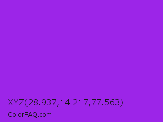 XYZ 28.937,14.217,77.563 Color is a normal purple color and the nearest color is Veronica #a020f0. Hex code #9c25e8 and RGB value is rgb(156,37,232). In RGB color space, this color is composed of 61% red, 15% green, 91% blue, In CMYK color space, this color is composed of 33% cyan, 84% magenta, 0% yellow , 9% black , In HSL color space, this color has a hue angle of 277° , 81% saturation and 53% lightness.