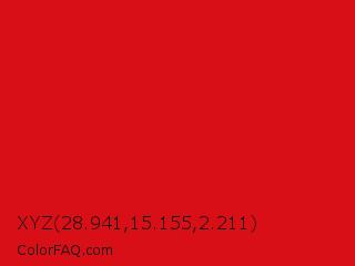 XYZ 28.941,15.155,2.211 Color is a normal red color and the nearest color is Lava #cf1020. Hex code #d90f17 and RGB value is rgb(217,15,23). In RGB color space, this color is composed of 85% red, 6% green, 9% blue, In CMYK color space, this color is composed of 0% cyan, 93% magenta, 89% yellow , 15% black , In HSL color space, this color has a hue angle of 358° , 87% saturation and 45% lightness.