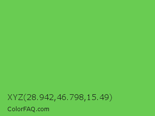 XYZ 28.942,46.798,15.49 Color is a normal green color and the nearest color is Mantis #74c365. Hex code #69cc52 and RGB value is rgb(105,204,82). In RGB color space, this color is composed of 41% red, 80% green, 32% blue, In CMYK color space, this color is composed of 49% cyan, 0% magenta, 60% yellow , 20% black , In HSL color space, this color has a hue angle of 109° , 54% saturation and 56% lightness.