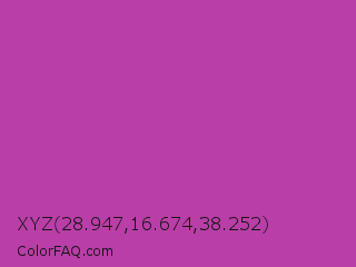 XYZ 28.947,16.674,38.252 Color is a normal magenta color and the nearest color is Byzantine #bd33a4. Hex code #ba3ea7 and RGB value is rgb(186,62,167). In RGB color space, this color is composed of 73% red, 24% green, 65% blue, In CMYK color space, this color is composed of 0% cyan, 67% magenta, 10% yellow , 27% black , In HSL color space, this color has a hue angle of 309° , 50% saturation and 49% lightness.