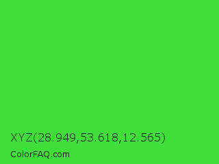 XYZ 28.949,53.618,12.565 Color is a normal green color and the nearest color is Lime Green #32cd32. Hex code #40de38 and RGB value is rgb(64,222,56). In RGB color space, this color is composed of 25% red, 87% green, 22% blue, In CMYK color space, this color is composed of 71% cyan, 0% magenta, 75% yellow , 13% black , In HSL color space, this color has a hue angle of 117° , 72% saturation and 55% lightness.