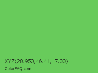 XYZ 28.953,46.41,17.33 Color is a normal green color and the nearest color is Mantis #74c365. Hex code #68cb5b and RGB value is rgb(104,203,91). In RGB color space, this color is composed of 41% red, 80% green, 36% blue, In CMYK color space, this color is composed of 49% cyan, 0% magenta, 55% yellow , 20% black , In HSL color space, this color has a hue angle of 113° , 52% saturation and 58% lightness.
