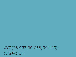 XYZ 28.957,36.038,54.145 Color is a normal cyan color and the nearest color is Fountain Blue #56b4be. Hex code #5fadbe and RGB value is rgb(95,173,190). In RGB color space, this color is composed of 37% red, 68% green, 75% blue, In CMYK color space, this color is composed of 50% cyan, 9% magenta, 0% yellow , 25% black , In HSL color space, this color has a hue angle of 191° , 42% saturation and 56% lightness.