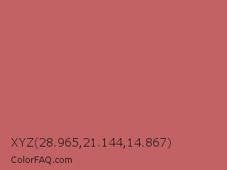 XYZ 28.965,21.144,14.867 Color is a normal red color and the nearest color is Fuzzy Wuzzy #cc6666. Hex code #c26265 and RGB value is rgb(194,98,101). In RGB color space, this color is composed of 76% red, 38% green, 40% blue, In CMYK color space, this color is composed of 0% cyan, 49% magenta, 48% yellow , 24% black , In HSL color space, this color has a hue angle of 358° , 44% saturation and 57% lightness.