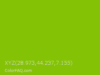 XYZ 28.973,44.237,7.155 Color is a normal green color and the nearest color is Apple Green #8db600. Hex code #82c405 and RGB value is rgb(130,196,5). In RGB color space, this color is composed of 51% red, 77% green, 2% blue, In CMYK color space, this color is composed of 34% cyan, 0% magenta, 97% yellow , 23% black , In HSL color space, this color has a hue angle of 81° , 95% saturation and 39% lightness.
