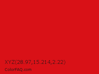 XYZ 28.97,15.214,2.22 Color is a normal red color and the nearest color is Lava #cf1020. Hex code #d91117 and RGB value is rgb(217,17,23). In RGB color space, this color is composed of 85% red, 7% green, 9% blue, In CMYK color space, this color is composed of 0% cyan, 92% magenta, 89% yellow , 15% black , In HSL color space, this color has a hue angle of 358° , 85% saturation and 46% lightness.