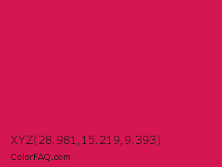 XYZ 28.981,15.219,9.393 Color is a normal rose color and the nearest color is Debian Red #d70a53. Hex code #d41752 and RGB value is rgb(212,23,82). In RGB color space, this color is composed of 83% red, 9% green, 32% blue, In CMYK color space, this color is composed of 0% cyan, 89% magenta, 61% yellow , 17% black , In HSL color space, this color has a hue angle of 341° , 80% saturation and 46% lightness.