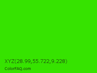 XYZ 28.99,55.722,9.228 Color is a normal green color and the nearest color is Harlequin #3fff00. Hex code #36e300 and RGB value is rgb(54,227,0). In RGB color space, this color is composed of 21% red, 89% green, 0% blue, In CMYK color space, this color is composed of 76% cyan, 0% magenta, 100% yellow , 11% black , In HSL color space, this color has a hue angle of 106° , 100% saturation and 45% lightness.