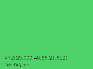 XYZ 29.009,48.86,21.812 Color is a normal green color and the nearest color is Emerald #50c878. Hex code #50d26b and RGB value is rgb(80,210,107). In RGB color space, this color is composed of 31% red, 82% green, 42% blue, In CMYK color space, this color is composed of 62% cyan, 0% magenta, 49% yellow , 18% black , In HSL color space, this color has a hue angle of 132° , 59% saturation and 57% lightness.