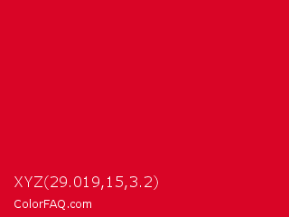 XYZ 29.019,15,3.2 Color is a normal red color and the nearest color is Medium Candy Apple Red #e2062c. Hex code #d90526 and RGB value is rgb(217,5,38). In RGB color space, this color is composed of 85% red, 2% green, 15% blue, In CMYK color space, this color is composed of 0% cyan, 98% magenta, 82% yellow , 15% black , In HSL color space, this color has a hue angle of 351° , 95% saturation and 44% lightness.