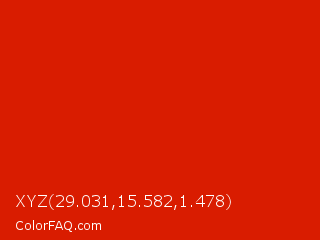 XYZ 29.031,15.582,1.478 Color is a normal red color and the nearest color is Rosso Corsa #d40000. Hex code #d91c00 and RGB value is rgb(217,28,0). In RGB color space, this color is composed of 85% red, 11% green, 0% blue, In CMYK color space, this color is composed of 0% cyan, 87% magenta, 100% yellow , 15% black , In HSL color space, this color has a hue angle of 8° , 100% saturation and 43% lightness.