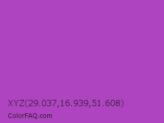 XYZ 29.037,16.939,51.608 Color is a normal purple color and the nearest color is Purple Plum #9c51b6. Hex code #ae44c0 and RGB value is rgb(174,68,192). In RGB color space, this color is composed of 68% red, 27% green, 75% blue, In CMYK color space, this color is composed of 9% cyan, 65% magenta, 0% yellow , 25% black , In HSL color space, this color has a hue angle of 291° , 50% saturation and 51% lightness.