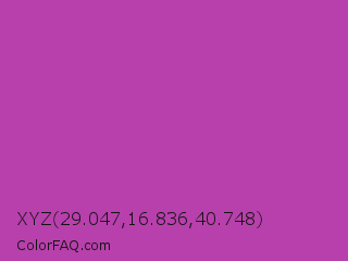 XYZ 29.047,16.836,40.748 Color is a normal magenta color and the nearest color is Byzantine #bd33a4. Hex code #b840ac and RGB value is rgb(184,64,172). In RGB color space, this color is composed of 72% red, 25% green, 67% blue, In CMYK color space, this color is composed of 0% cyan, 65% magenta, 7% yellow , 28% black , In HSL color space, this color has a hue angle of 306° , 48% saturation and 49% lightness.