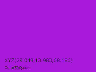 XYZ 29.049,13.983,68.186 Color is a normal purple color and the nearest color is Vivid Mulberry #b80ce3. Hex code #a718db and RGB value is rgb(167,24,219). In RGB color space, this color is composed of 65% red, 9% green, 86% blue, In CMYK color space, this color is composed of 24% cyan, 89% magenta, 0% yellow , 14% black , In HSL color space, this color has a hue angle of 284° , 80% saturation and 48% lightness.