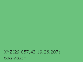XYZ 29.057,43.19,26.207 Color is a normal green color and the nearest color is Iguana Green #71bc78. Hex code #6bc27d and RGB value is rgb(107,194,125). In RGB color space, this color is composed of 42% red, 76% green, 49% blue, In CMYK color space, this color is composed of 45% cyan, 0% magenta, 36% yellow , 24% black , In HSL color space, this color has a hue angle of 132° , 42% saturation and 59% lightness.