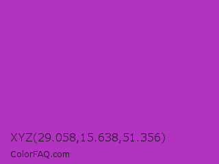 XYZ 29.058,15.638,51.356 Color is a normal magenta color and the nearest color is Dark Orchid #9932cc. Hex code #b233c0 and RGB value is rgb(178,51,192). In RGB color space, this color is composed of 70% red, 20% green, 75% blue, In CMYK color space, this color is composed of 7% cyan, 73% magenta, 0% yellow , 25% black , In HSL color space, this color has a hue angle of 294° , 58% saturation and 48% lightness.