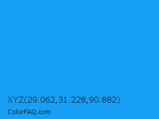 XYZ 29.062,31.228,90.882 Color is a normal blue color and the nearest color is Button Blue #24a0ed. Hex code #179ef5 and RGB value is rgb(23,158,245). In RGB color space, this color is composed of 9% red, 62% green, 96% blue, In CMYK color space, this color is composed of 91% cyan, 36% magenta, 0% yellow , 4% black , In HSL color space, this color has a hue angle of 204° , 92% saturation and 53% lightness.