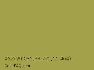 XYZ 29.085,33.771,11.464 Color is a normal yellow color and the nearest color is Brass #b5a642. Hex code #a3a14a and RGB value is rgb(163,161,74). In RGB color space, this color is composed of 64% red, 63% green, 29% blue, In CMYK color space, this color is composed of 0% cyan, 1% magenta, 55% yellow , 36% black , In HSL color space, this color has a hue angle of 59° , 38% saturation and 46% lightness.